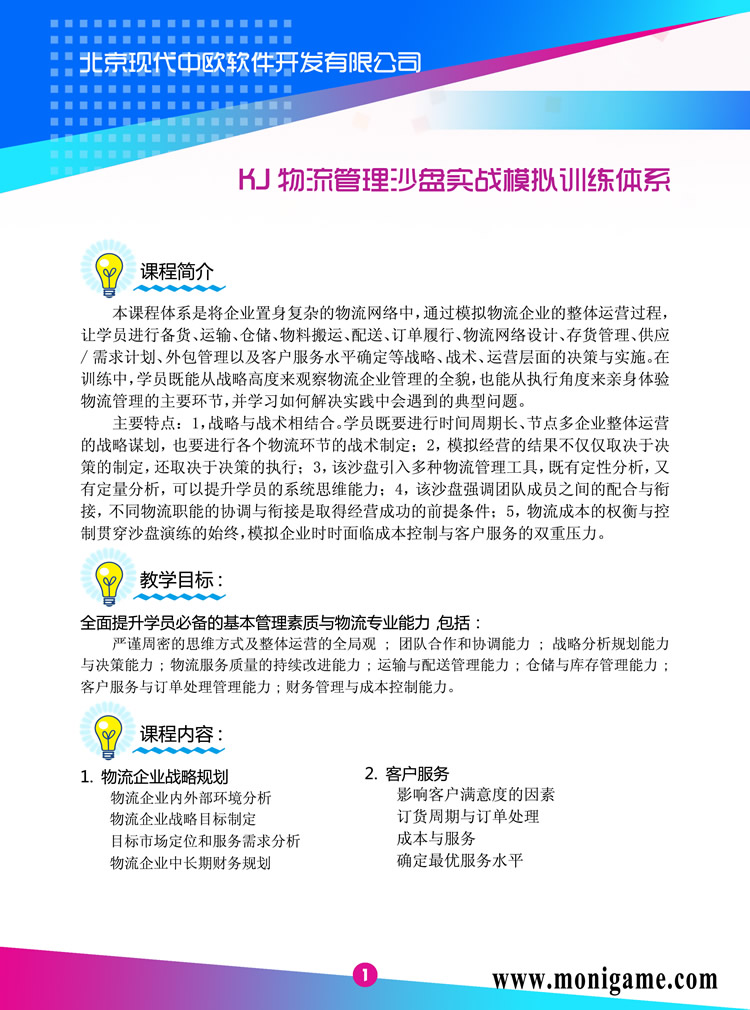 物流管理沙盤模擬訓練系統(tǒng)是將企業(yè)置身復雜的物流網(wǎng)絡中,通過模擬物流企業(yè)的整體運營過程,讓學員進行備貨、運輸、倉儲、物料搬運、配送、訂單履行、物流網(wǎng)絡設計、存貨管理、供應/需求計劃、外包管理以及客戶服務水平確定等戰(zhàn)略、戰(zhàn)術、運營層面的決策與實施。